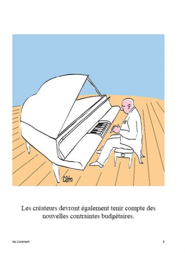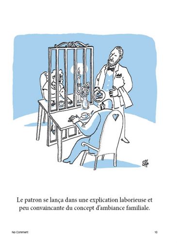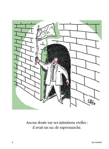 « La contemplation de ces dessins nous plonge dans une certaine mélancolie, celle qui surgit face au désarmant monde de l’absurde. Dans ces décors pétrifiés, des hommes et des femmes agissent, sérieusement, comme habités par la nécessité de remplir leur rôle le mieux possible, avec dignité, sans émotion. Ils sont là de toute éternité. Ils nous retiennent dans leurs gestes et nous renvoient à l’insupportable incommunicabilité entre les êtres dans des décors signifiants : ce sont des murs aveugles de l’enfermement, des grilles de séparation, des barreaux de prison, ce sont des miroirs, des loupes et des écrans que l’on scrute attentivement pour y lire une autre réalité, peut-être la vraie ? Les figures masculines sont massives, hommes « importants » aux regards voilés par des lunettes opaques, militaire suicidaire, artiste en salopette dans sa forêt de crayon. Les figures féminines sont rares, gracieuses, surgies d’un autre continent, inabordables, épiées et contemplées. »