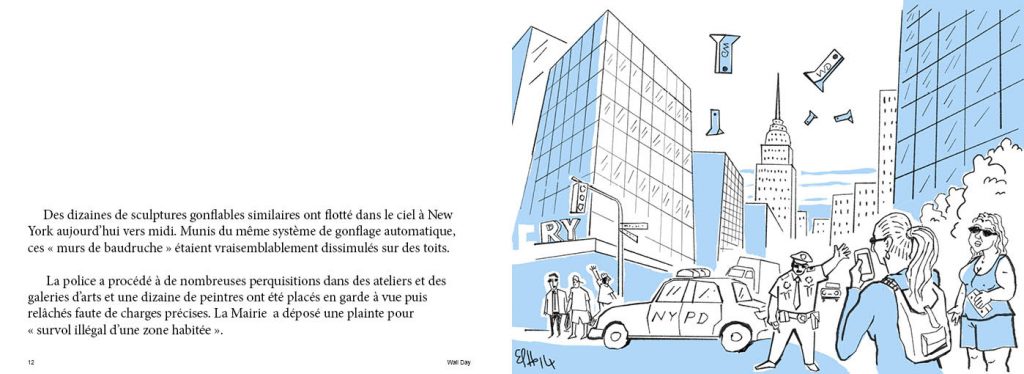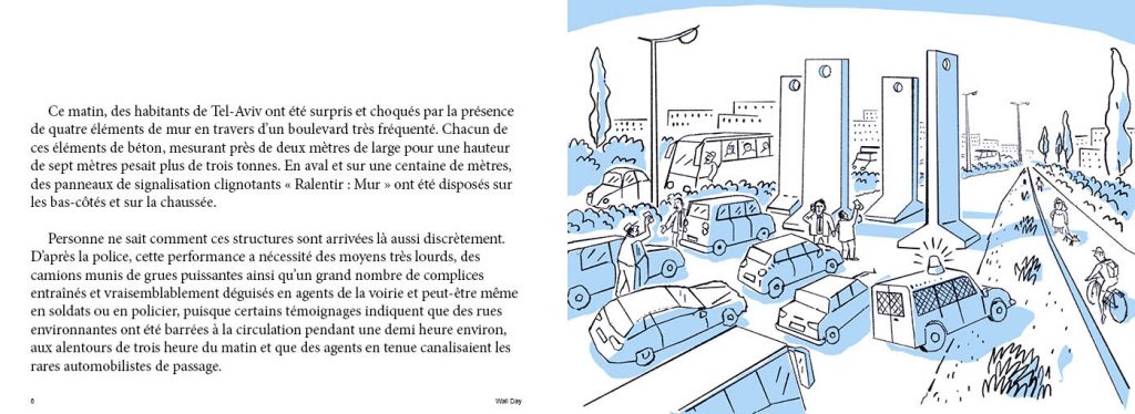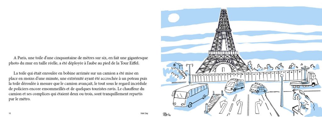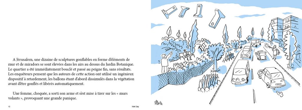 J’avais d’abord pensé à dessiner des oiseaux portant des chaussures à talons aiguilles et j’ai représenté des chouettes, des mouettes, des mésanges, affublées de longues jambes enveloppées de bas résilles et portant des chaussures improbables. Puis, je ne sais pourquoi, j’ai pensé aux oiseaux de Gaza emmurés, affamés, bombardés. Alors j’ai choisi de parler d’une exposition qui a eu lieu dans quelques années, ou qui aura lieu hier, et qui a réuni des dizaines de street-artistes du monde entier qui ont accompli un tour de force spectaculaire, une opération commando incroyable pour dénoncer le mur de séparation entre Israël et la Palestine.